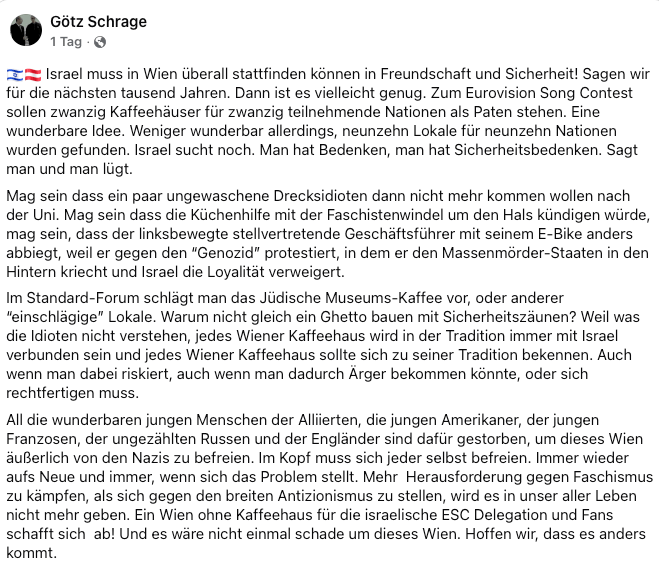 Bämm, das saß. Schrage ist nicht nur nicht fähig zu reflektieren, er hat sich offensichtlich die Lebenslüge zu eigen gemacht, dass es sich ja nur um einen Betriebsunfall handeln kann und dahinter die „ungewaschene Drecksidioten“ stecken können, nicht wissend, dass Wien von den Nazis befreit wurde. Nun wurde Österreich nicht von den Nazis befreit, die Alliierten die er beschreibt waren keine Sozialarbeiter und Wohlfühlpsychologen sondern haben ein Menschenverachtendes Regime unter den größten Anstrengungen besiegen müssen. Und da kommt Schrage mit seinem Kaffeehauskitsch, der sich die Geschichte zurecht rücken will in dem er davon schreibt, „jedes Wiener Kaffeehaus wird in der Tradition immer mit Israel verbunden sein und jedes Wiener Kaffeehaus sollte sich zu seiner Tradition bekennen.“ Kein Wiener Kaffeehaus ist in Tradition mit Israel verbunden, es war das jüdische Bürgertum, dass die Wiener Kaffeehaustradition begründete und die mit 1938 schlagartig endete.